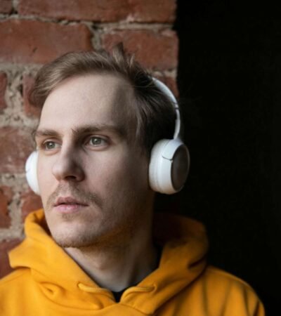 A collection of gaming devices and accessories on a dark background, including headphones, a gaming controller, and a Nintendo Switch with colored joy-cons. A white earbud case and a small electronic device are also present.